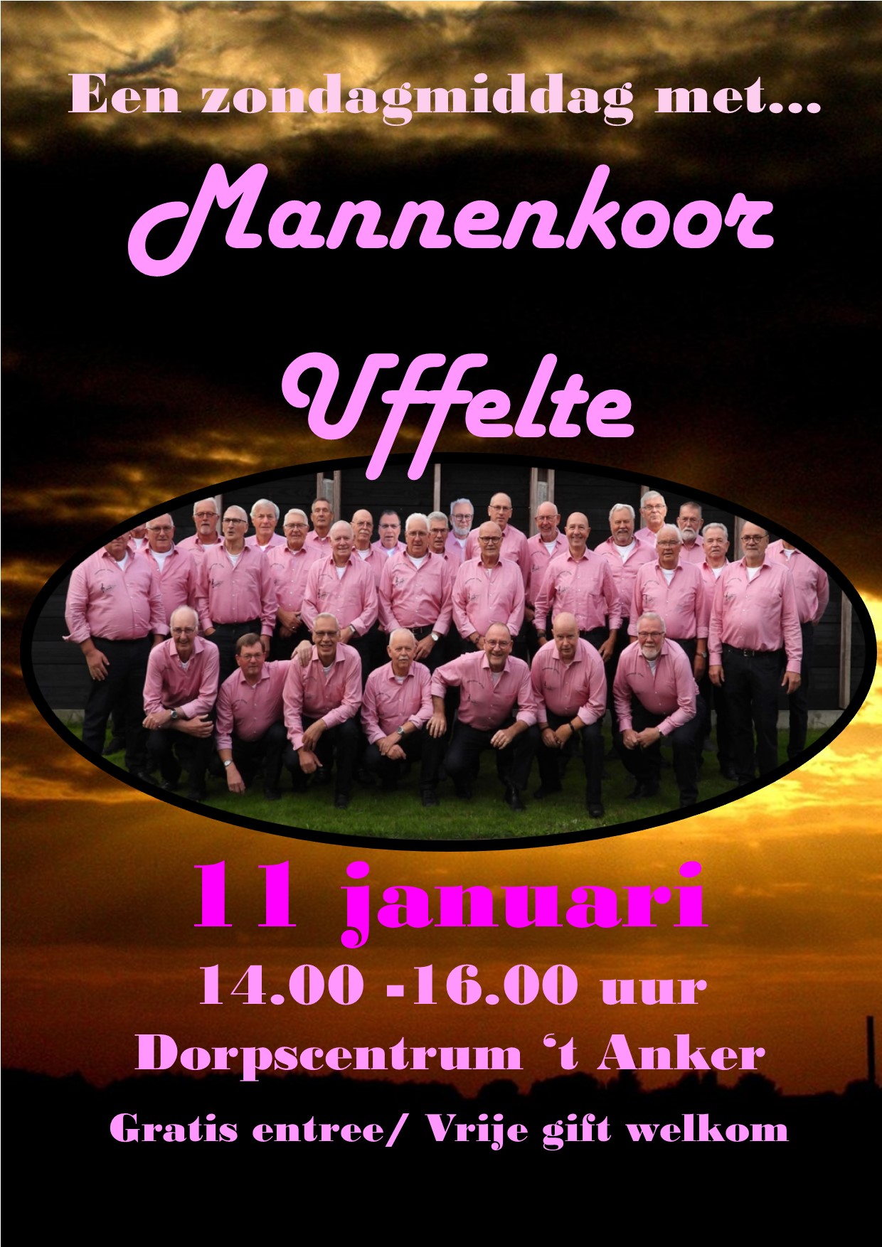 Op zondag 11 januari komt mannenkoor Uffelte naar 't Anker. Zij zijn al vaker geweest en het optreden is altijd gezellig en aangenaam om naar te luisteren. De middag begint om 14.00 uur. De entree is gratis, maar een vrije gift wordt op prijs gesteld